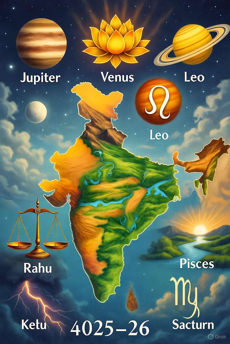 देहरादून वेदिक ज्योतिष में गोचर (ट्रांजिट) ग्रहों की स्थिति किसी राष्ट्र या व्यक्ति के भविष्य को प्रभावित करने वाली प्रमुख कारक मानी जाती है। वर्तमान अक्टूबर 2025 में ग्रहों का गोचर—जैसे शुक्र का कन्या राशि में प्रवेश, गुरु-शुक्र का षष्ठम भावी योग, और राहु-केतु का कुंभ-सिंह में गोचर—भारत के लिए एक मिश्रित चित्र प्रस्तुत कर रहा है। भारत की कुंडली (मेष लग्न या वृष लग्न के आधार पर) में इन गोचरों का प्रभाव आर्थिक वृद्धि, सामाजिक सद्भाव, और वैश्विक संबंधों में प्रगति का संकेत देता है, लेकिन पर्यावरणीय चुनौतियां और आंतरिक अस्थिरता भी उभर सकती हैं। विशेषज्ञों के अनुसार, यह अवधि ‘संतुलन और समृद्धि’ की है, जहां सकारात्मक गोचर अवसर प्रदान करेंगे, लेकिन सावधानीपूर्वक निर्णय आवश्यक होंगे। आइए, वर्तमान गोचरों के आधार पर भारत के निकट भविष्य (2025-2026) का विश्लेषण करें। वर्तमान गोचर का अवलोकन: प्रमुख ग्रहों की स्थिति अक्टूबर 2025 में ग्रहों का गोचर भारत की कुंडली पर सकारात्मक-नकारात्मक दोनों प्रभाव डाल रहा है। सूर्य तुला राशि में (17 अक्टूबर से), बुध वृश्चिक में (24 अक्टूबर से), शुक्र कन्या में (8 अक्टूबर से), और मंगल तुला में (26 अक्टूबर तक) प्रवेश करेगा। गुरु-शुक्र का षष्ठम भावी योग (8 अक्टूबर) समृद्धि का संकेत देता है। राहु कुंभ और केतु सिंह में गोचर कर रहे हैं, जो नवाचार और सामाजिक परिवर्तन लाएंगे। शनि की वक्री गति पूरे महीने रहेगी, जो स्थिरता में बाधा डाल सकती है। ये गोचर भारत की कुंडली (मेष लग्न, चंद्र कर्क में) के 11वें भाव (लाभ) और 9वें भाव (भाग्य) को प्रभावित कर रहे हैं, जो आर्थिक वृद्धि और वैश्विक प्रतिष्ठा का संकेत देते हैं। आर्थिक समृद्धि: गुरु-शुक्र योग से वृद्धि, लेकिन शनि की बाधाएं गुरु और शुक्र का षष्ठम भावी योग (8 अक्टूबर) भारत के लिए आर्थिक विस्तार का शुभ संकेत है। यह योग व्यापार, कृषि और निवेश में वृद्धि लाएगा। शुक्र का कन्या गोचर (8 अक्टूबर) सेवा क्षेत्र को मजबूत करेगा, जबकि मंगल का तुला प्रवेश (26 अक्टूबर तक) साझेदारियों में लाभ देगा। राहु का कुंभ गोचर नवाचार को बढ़ावा देगा, जैसे डिजिटल अर्थव्यवस्था और स्टार्टअप्स में उछाल। हालांकि, शनि की वक्री गति (सभी अक्टूबर) कृषि और श्रम क्षेत्र में चुनौतियां पैदा कर सकती है। सूर्य का तुला गोचर (17 अक्टूबर) सरकारी योजनाओं में बदलाव लाएगा। समग्र रूप से, 2025-26 में जीडीपी वृद्धि 7-8% रहने की संभावना है, लेकिन मुद्रास्फीति पर नियंत्रण जरूरी। सामाजिक और राजनीतिक स्थिरता: राहु-केतु से परिवर्तन, सूर्य से नेतृत्व मजबूत राहु-केतु का गोचर (कुंभ-सिंह) सामाजिक परिवर्तनों का संकेत देता है। राहु कुंभ में सामाजिक न्याय और तकनीकी सुधार लाएगा, लेकिन केतु सिंह में राजनीतिक अस्थिरता 